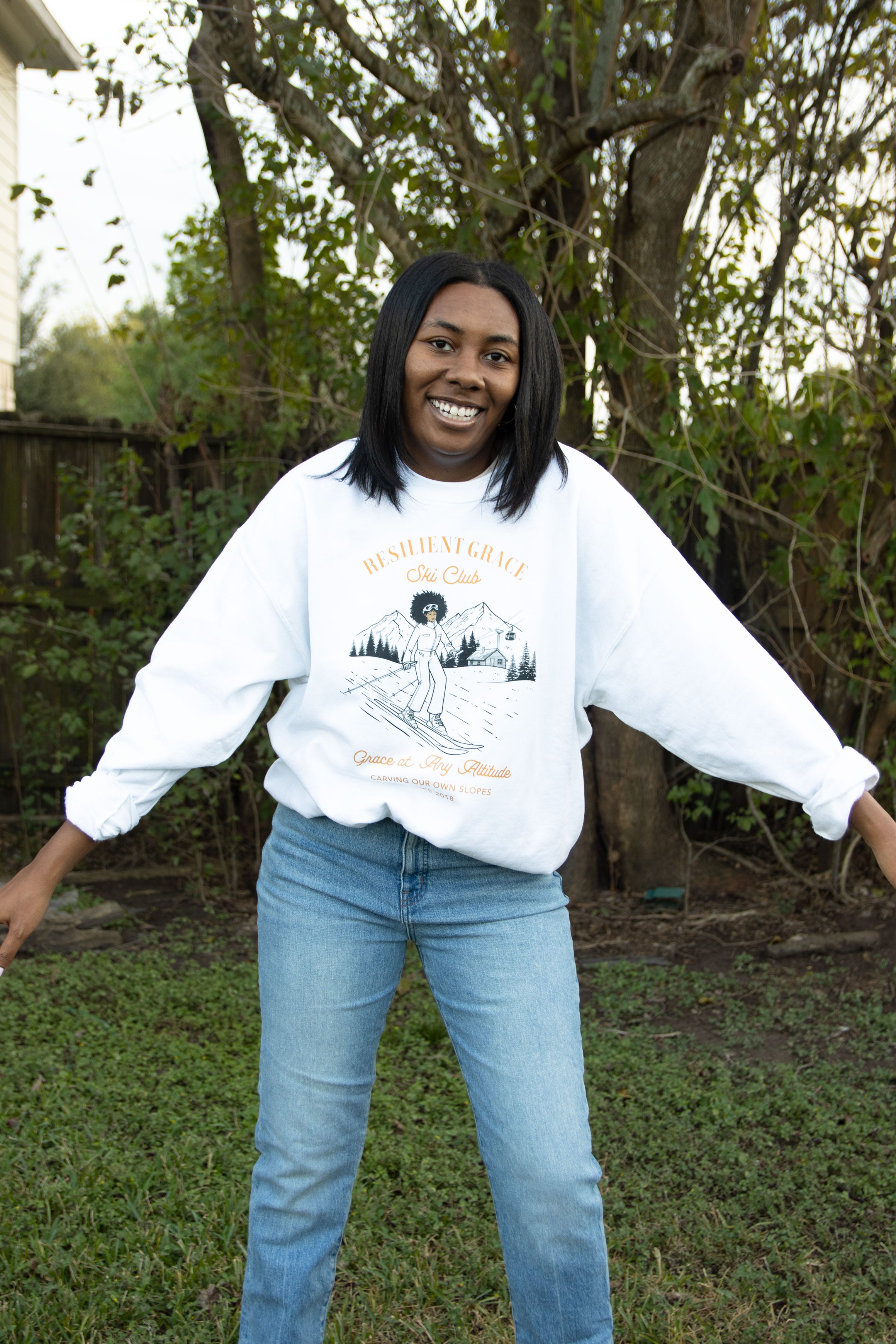 The Resilient Grace Ski Club Sweatshirt celebrates the rich, often overlooked history of Black ski culture, the joy, the community, and the courage to carve our own path.